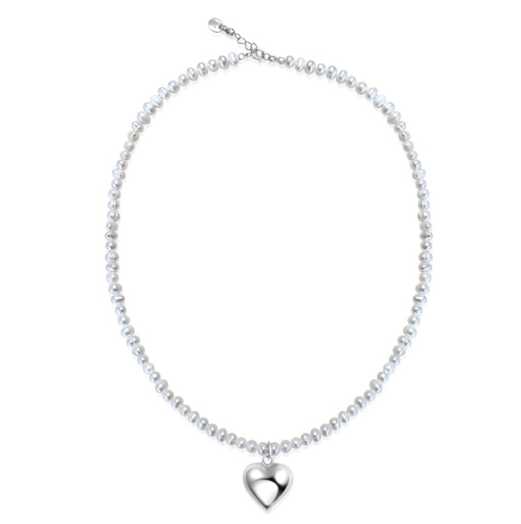 존재감 있는 매력을 선사하는 통통한 하트 펜던트와 담수 진주가 어우러진 사랑스러운 목걸이