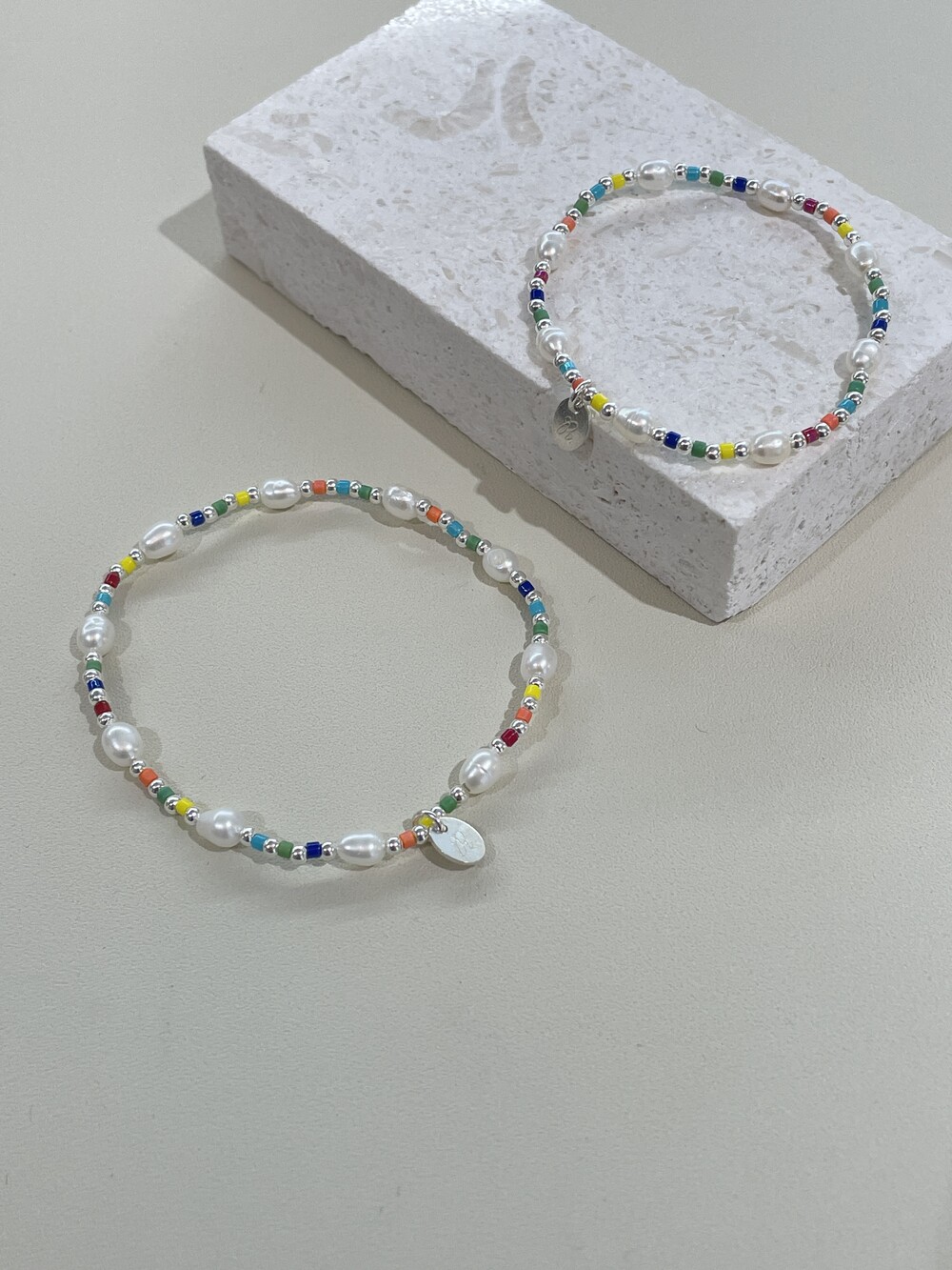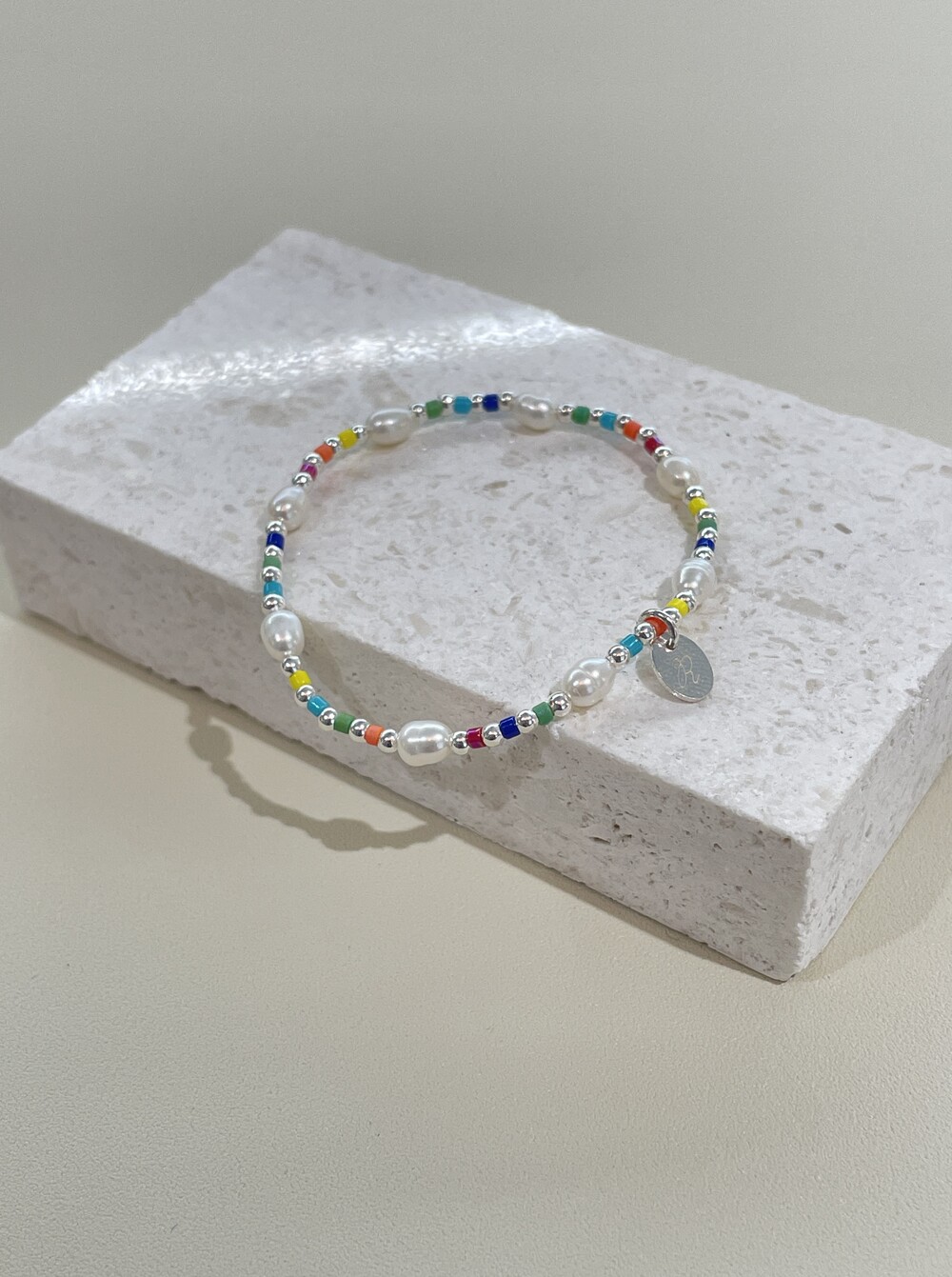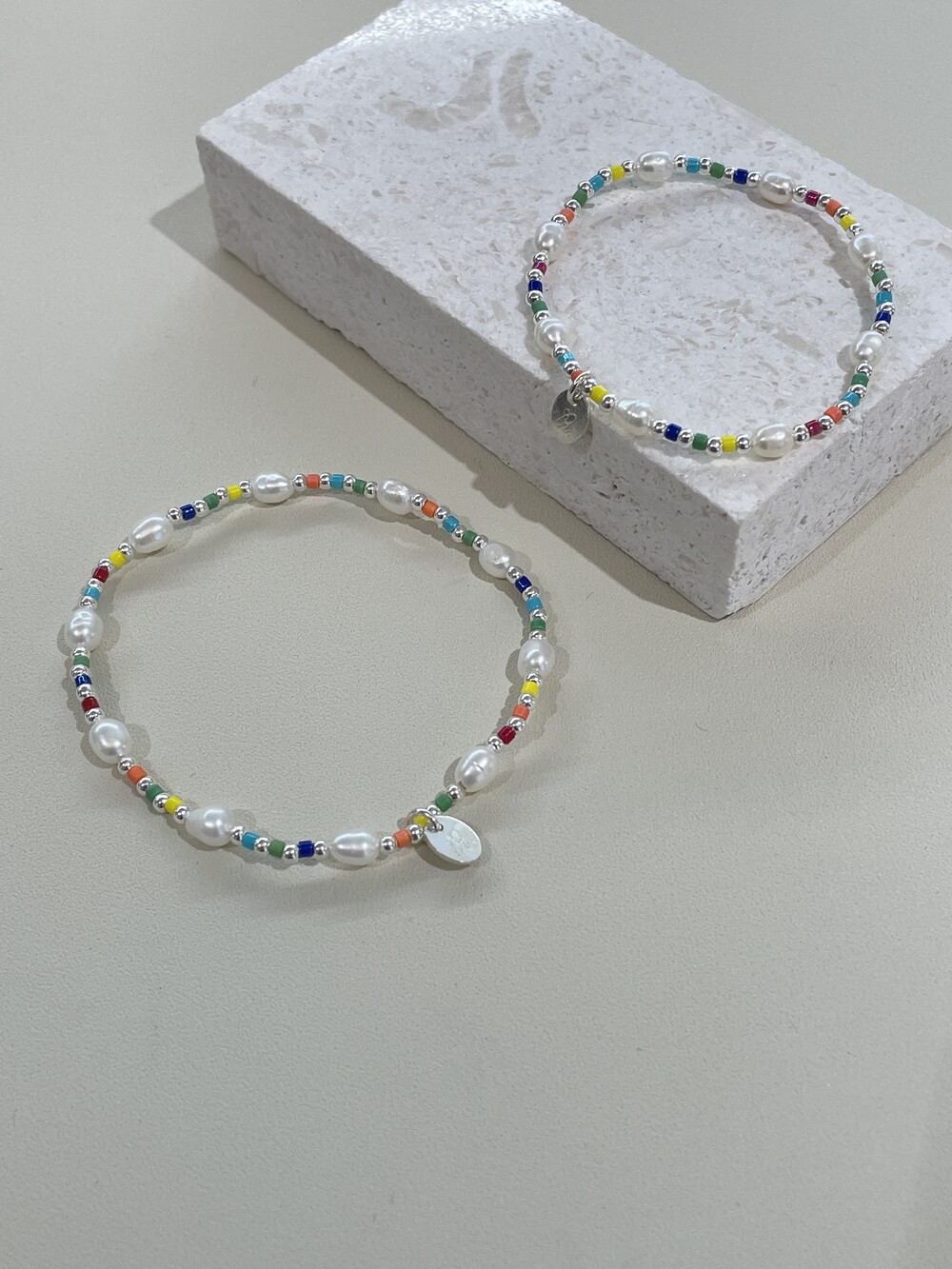 알록달록한 비즈와 영롱한 담수진주를 담은 우레탄 팔찌