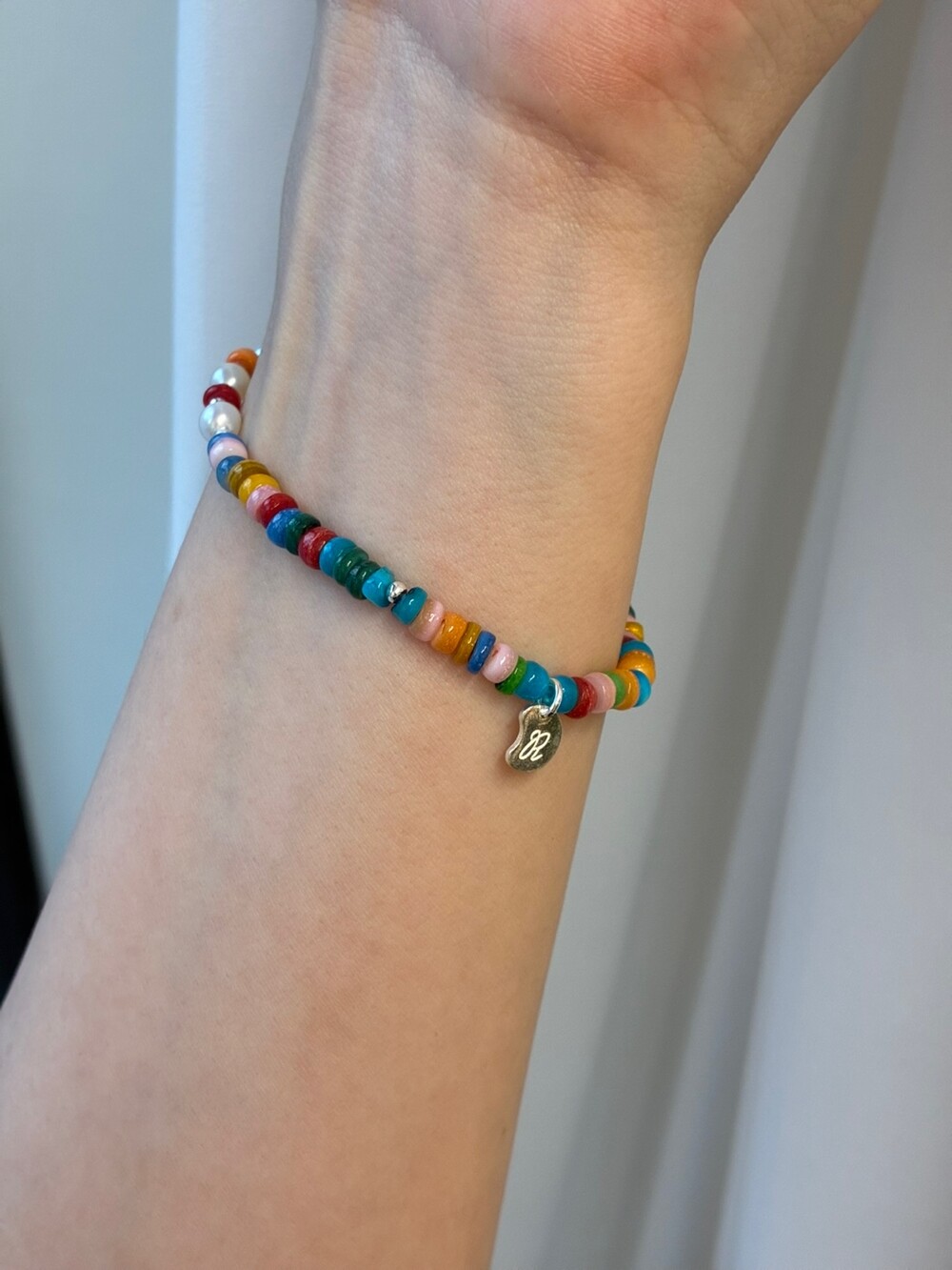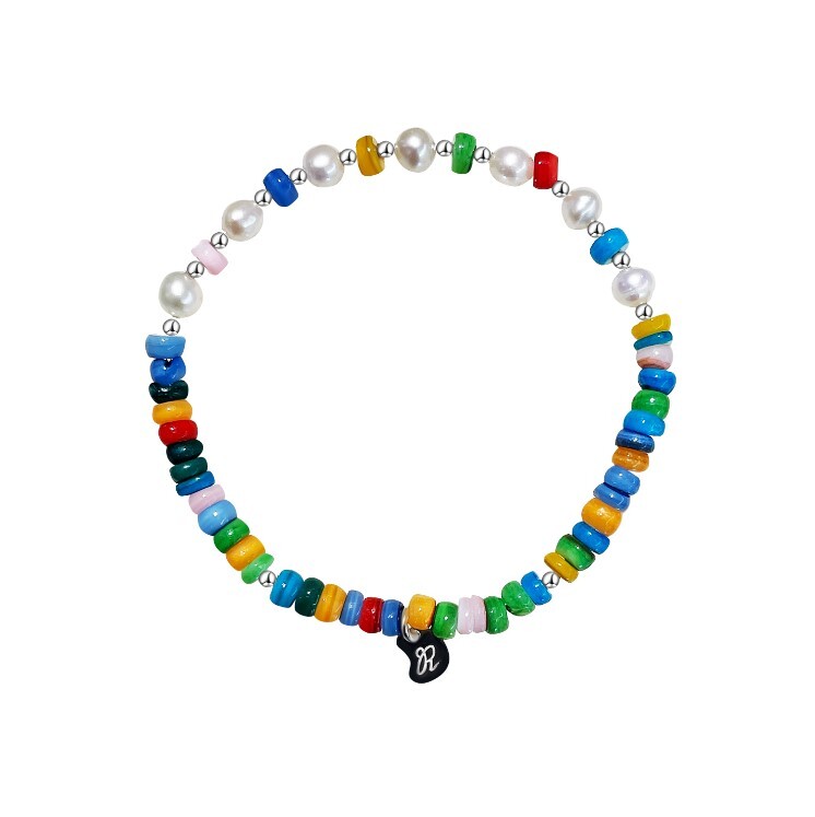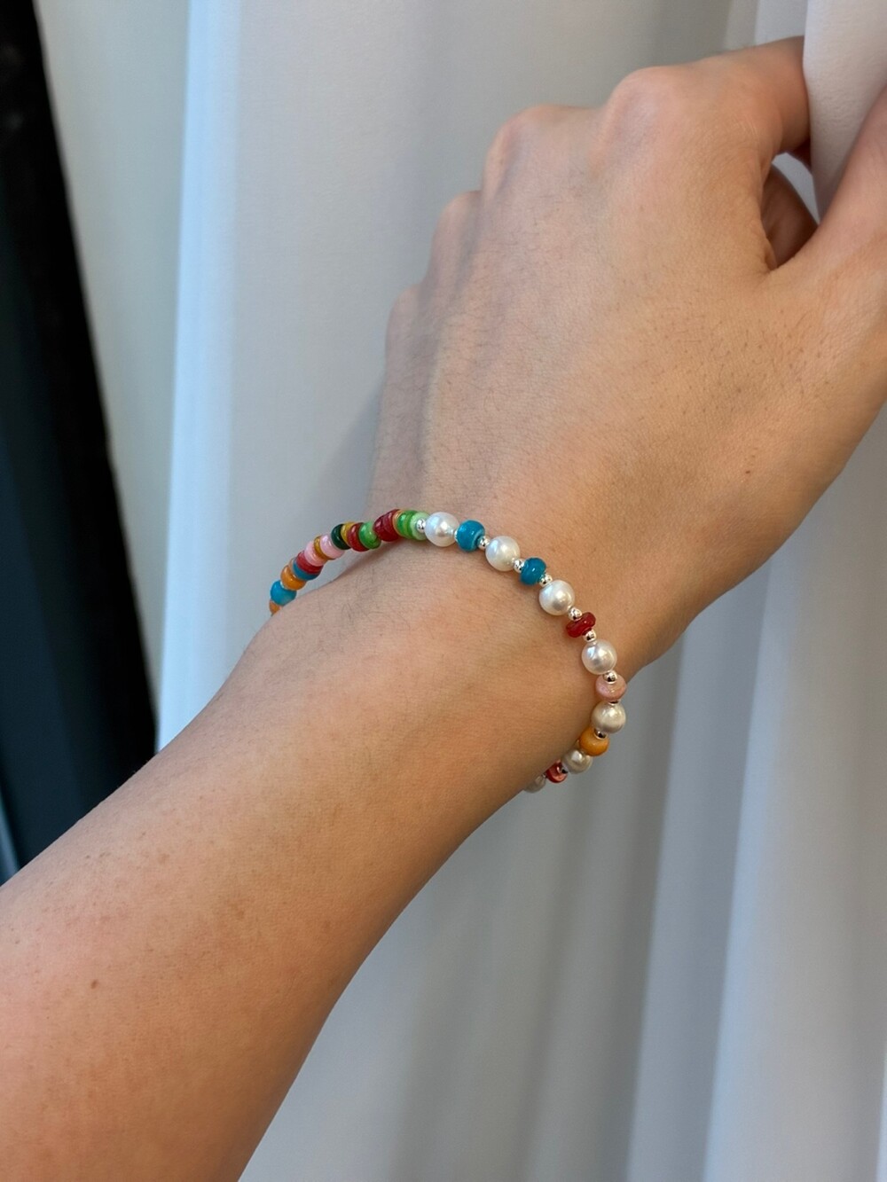 다채로운 컬러 자개와 담수 진주가 조합되어 유니크한 패턴과 입체감을 살린 우레탄 팔찌