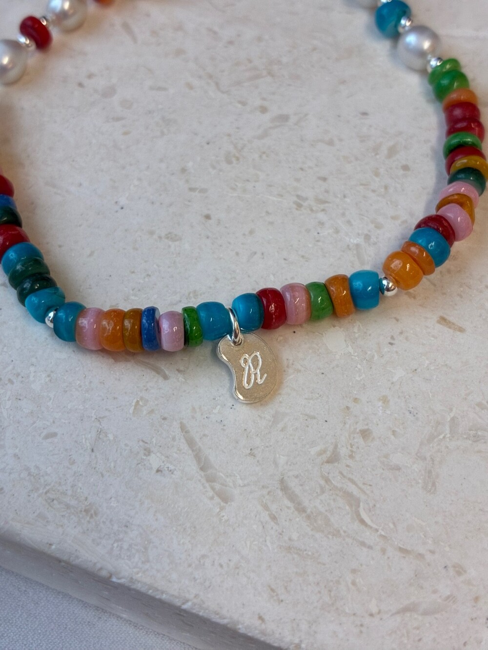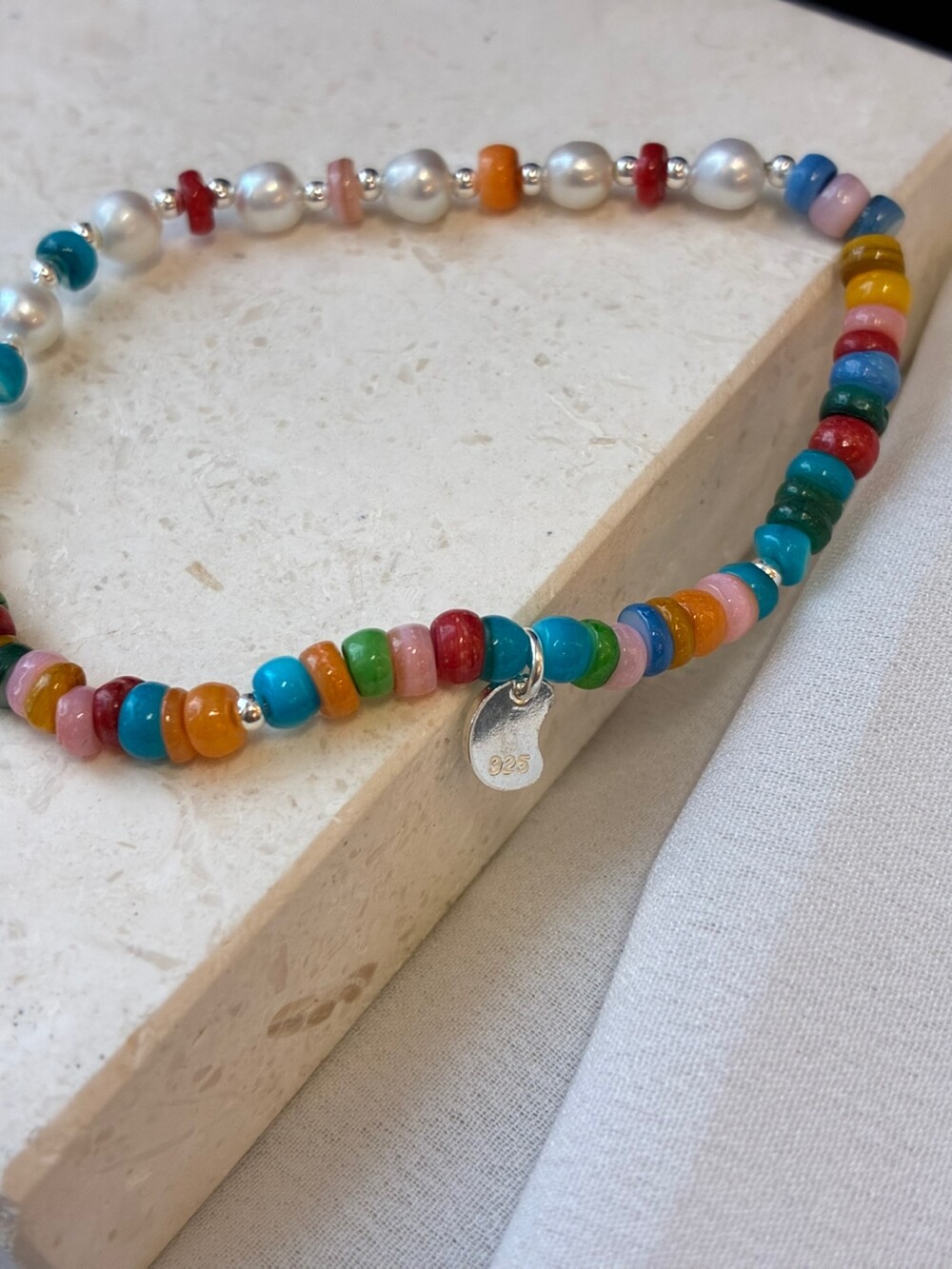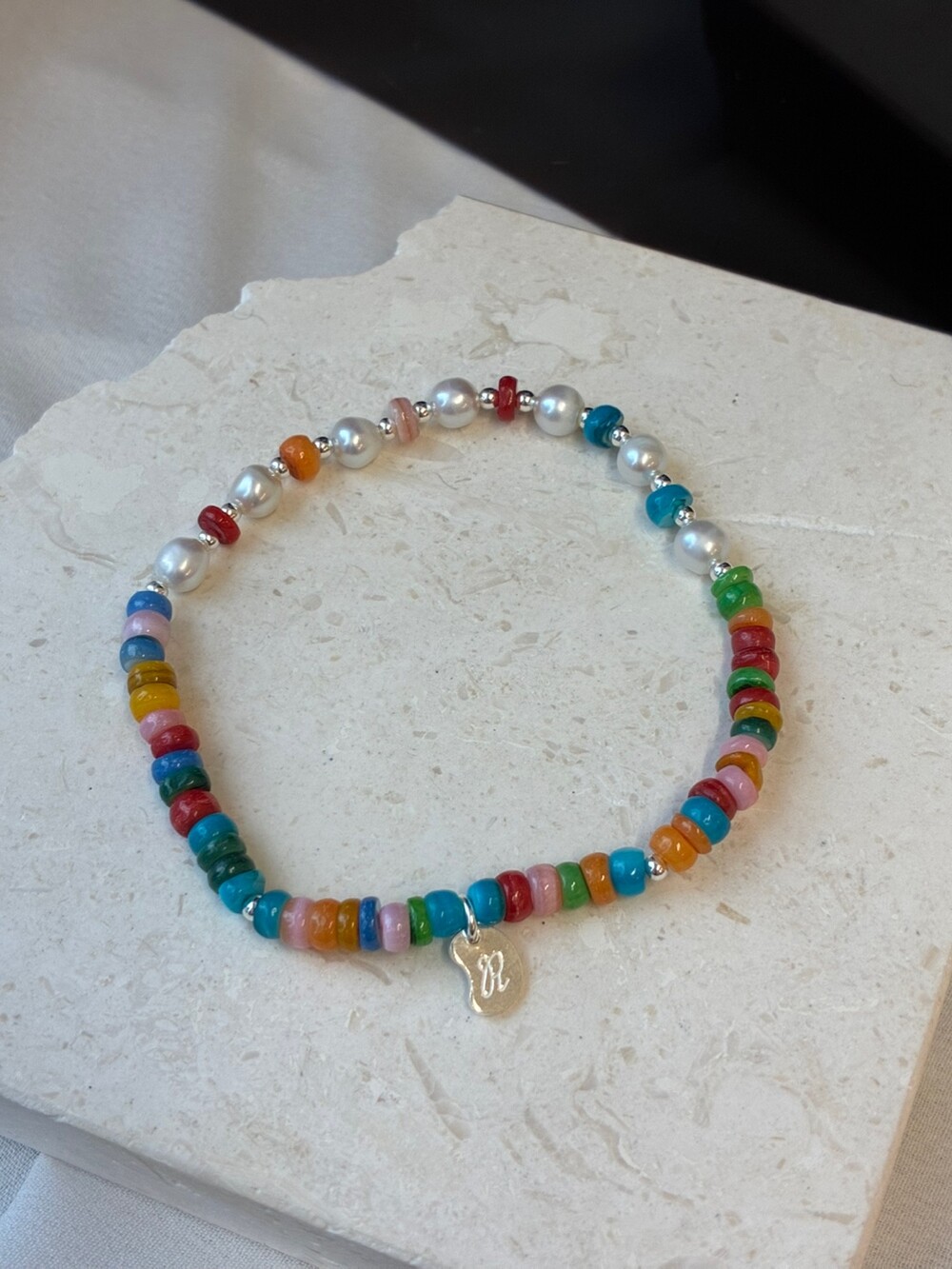 다채로운 컬러 자개와 담수 진주가 조합되어 유니크한 패턴과 입체감을 살린 우레탄 팔찌