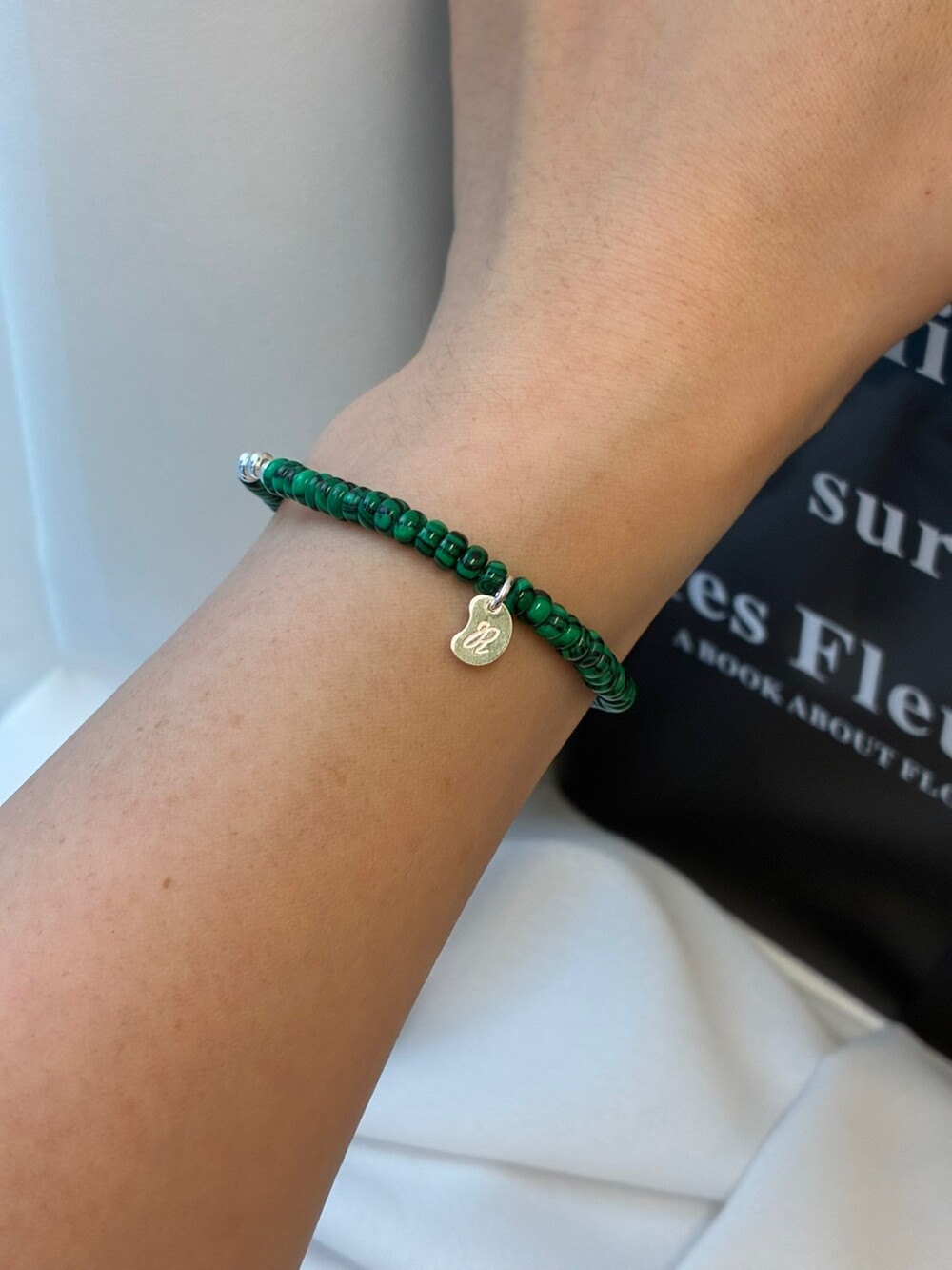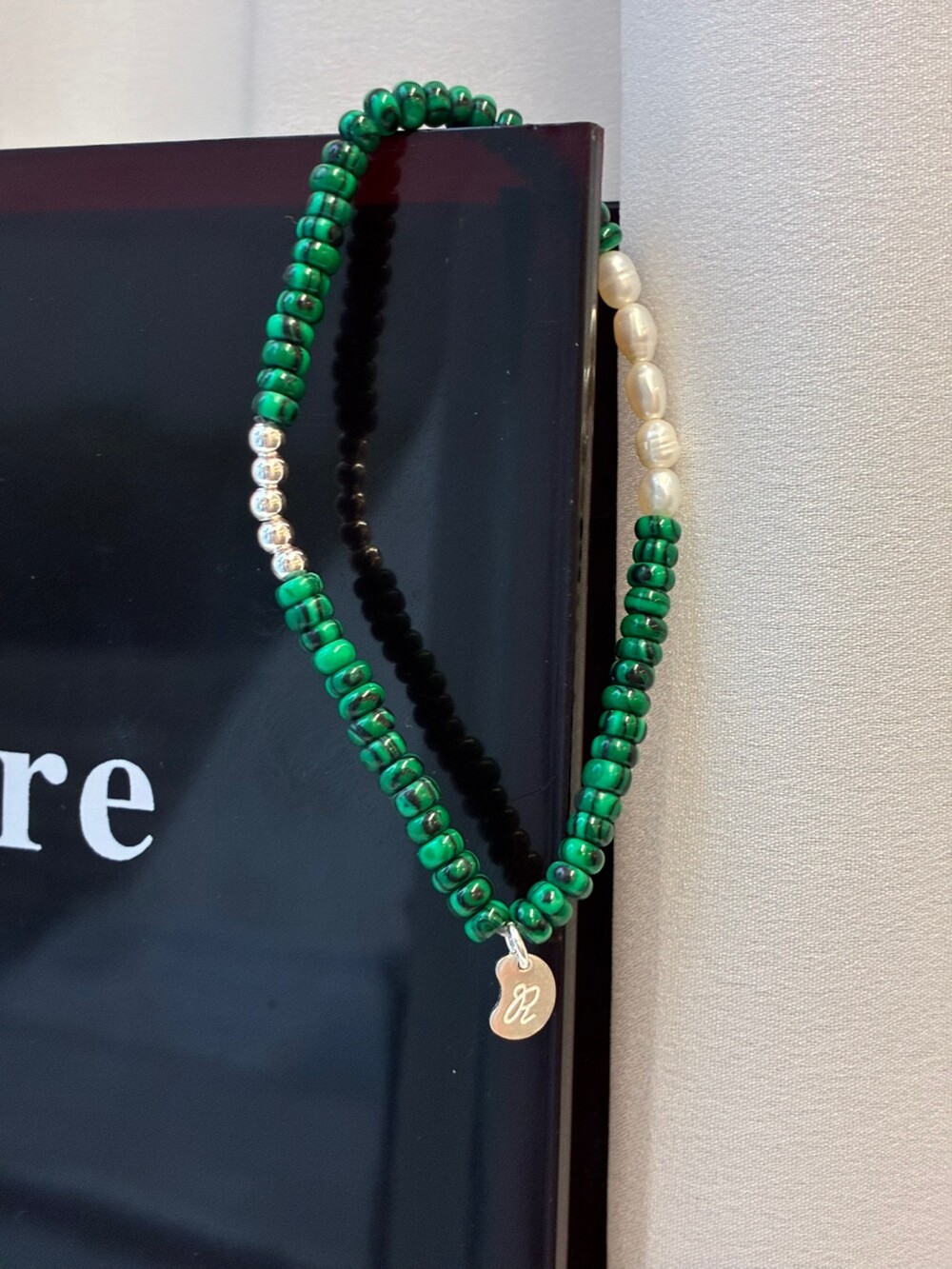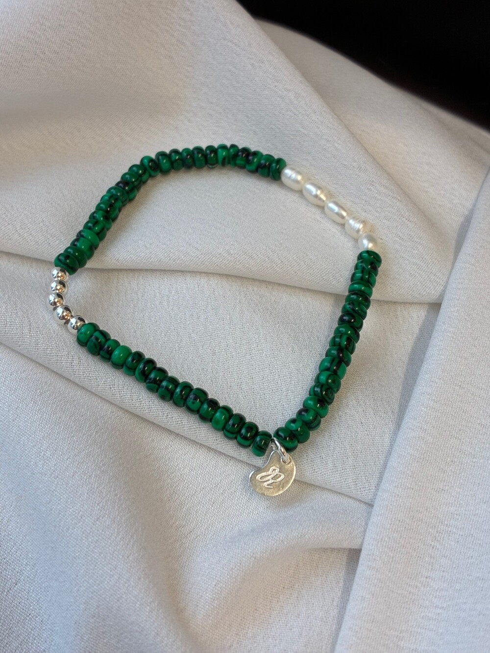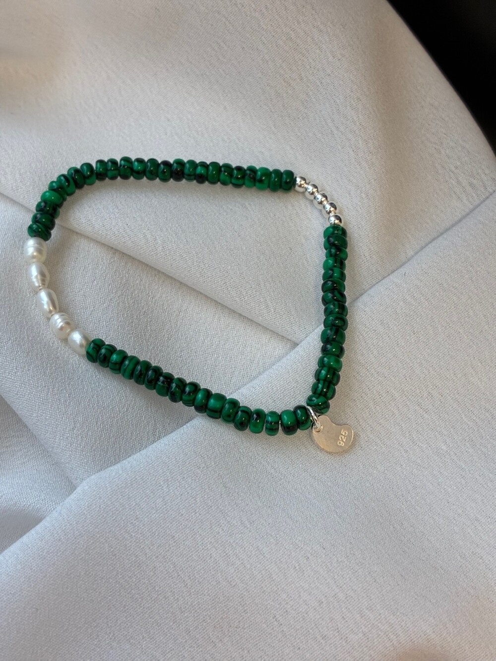 - material : 합성 말라카이트, 담수 진주, 925 silver, 우레탄 줄